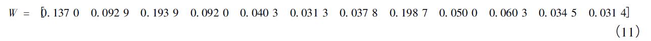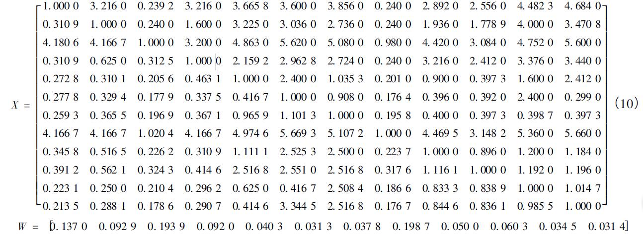 其中CI為一致性指標(biāo),RI為隨機(jī)一致性比率,當(dāng)矩陣階次為12時,RI=1.54。一致性指標(biāo)如式