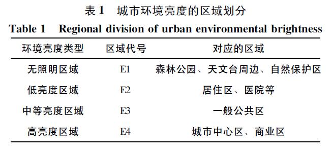 核心商業(yè)區(qū)又稱商業(yè)中心區(qū),是集商場、金融、服務(wù)和娛樂為一體的商業(yè)聚集區(qū)。在《室外照明干擾光限制規(guī)范》(DB11/T731—2010)中,商業(yè)區(qū)和城市中心區(qū)被一同劃分為高亮度區(qū)域E4(表1),其中不同區(qū)域由于其區(qū)域?qū)傩院凸δ艿膮^(qū)別,夜景照明亮度水平有所不同。