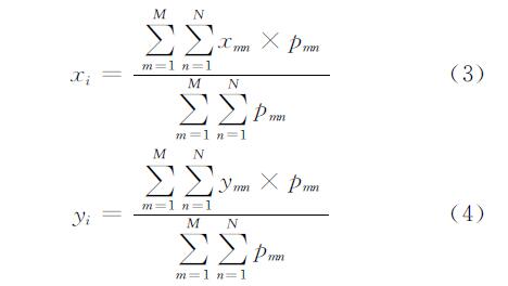 如圖2(b)所示,在經(jīng)過大津法處理后,各個燈點區(qū)域互不連通,又因為單個燈點區(qū)域近似為一圓形,且燈點的排列是有規(guī)則的,因此可把每一個LED燈點區(qū)域中心近似看作為燈點所在位置的中心點。本文采用一階矩質(zhì)心法(也稱作重心法)來確定各個燈點的中心位置,其計算表達(dá)式為