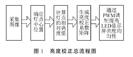 本文運用數(shù)字圖像處理技術(shù)對顯示屏上每個燈點的相對亮度進(jìn)行檢測和提取,計算出各個燈點的校正系數(shù)矩陣,并運用脈沖寬度調(diào)制(PWM)方法調(diào)節(jié)相應(yīng)燈點的亮度,從而提高全彩LED顯示屏的亮度均勻性。圖1為算法的總流程圖。