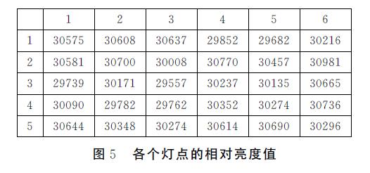 (2)以每個燈點的中心位置為中心,以操作距離為半徑作圓,如圖4所示,提取該圓形區(qū)域內(nèi)的各個像素的灰度值進(jìn)行求和。此灰度值的和即為該燈點的相對亮度值。在全部亮度提取完后保存為亮度數(shù)據(jù)文件,如圖5所示。