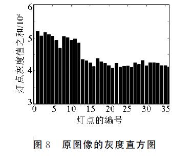 在確定燈點的具體位置之前,先要對采集到的圖像進(jìn)行灰度分布的統(tǒng)計,在所獲取的感光圖像中,由于燈點一般是由矩陣的方式排列,且燈點區(qū)域與背景區(qū)域的灰度值存在明顯的差異,有時還會產(chǎn)生環(huán)繞光的現(xiàn)象,因此需對圖像進(jìn)行二值化處理。本文采用了大津法(OTSU)確定閾值,該方法計算簡便,且在一定條件下不受圖像對比度和亮度變化的影響,所以應(yīng)用非常廣泛。其原理如下: