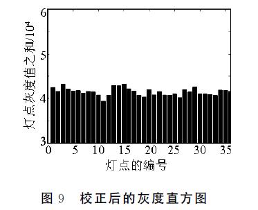 圖8和圖9分別為校正前和校正后各燈點的相對亮度值直方圖。通過比較可以看出,校正前直方圖數(shù)據(jù)的差異性比較大,而校正之后直方圖數(shù)據(jù)的差異相對比較小,在特殊的情況下,如果統(tǒng)計的數(shù)據(jù)不存在任何的差異,直方圖會呈現(xiàn)一條直線。從實驗數(shù)據(jù)中可以發(fā)現(xiàn),在經(jīng)過亮度校正后,亮度均勻性得到了很好的改善。
